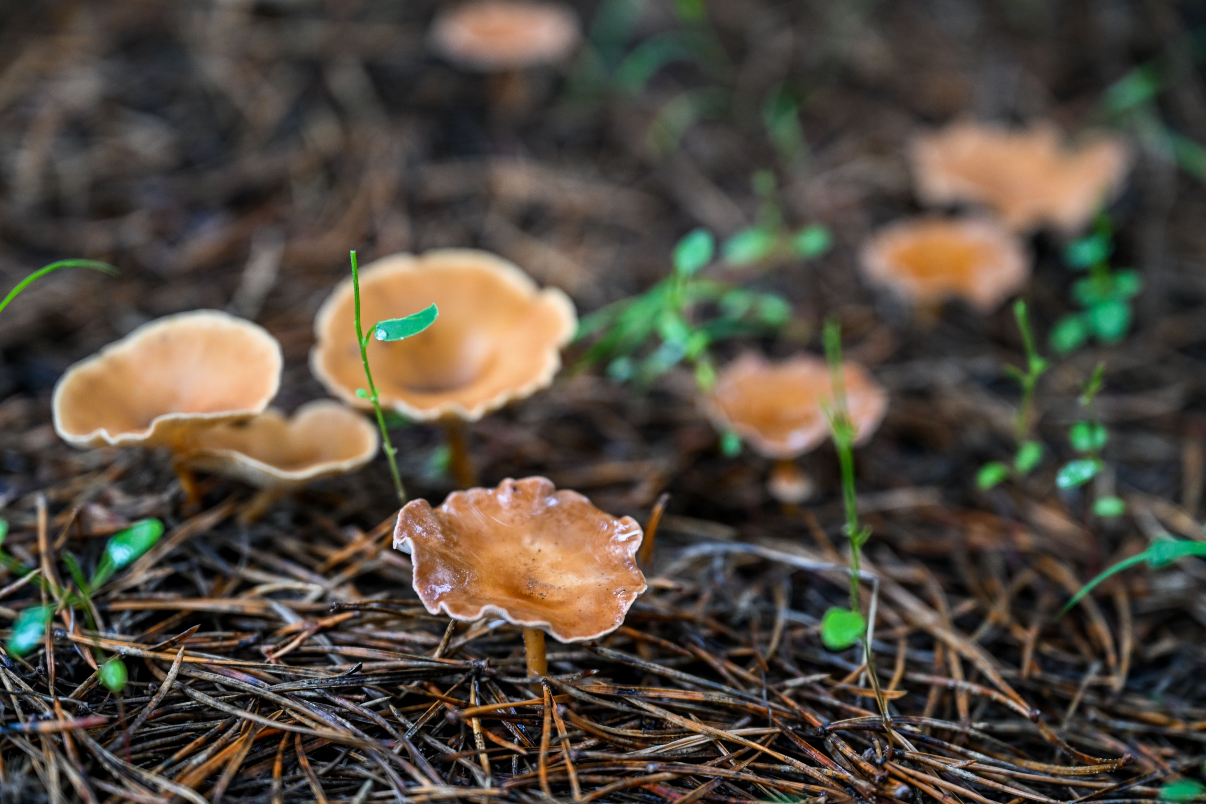 這是在內蒙古通遼市科爾沁左翼后旗的科爾沁沙地“雙百萬畝”綜合治理工程努古斯臺項目區內,樟子松林下生長的蘑菇(2024年8月3日攝)。新華社記者 連振 攝