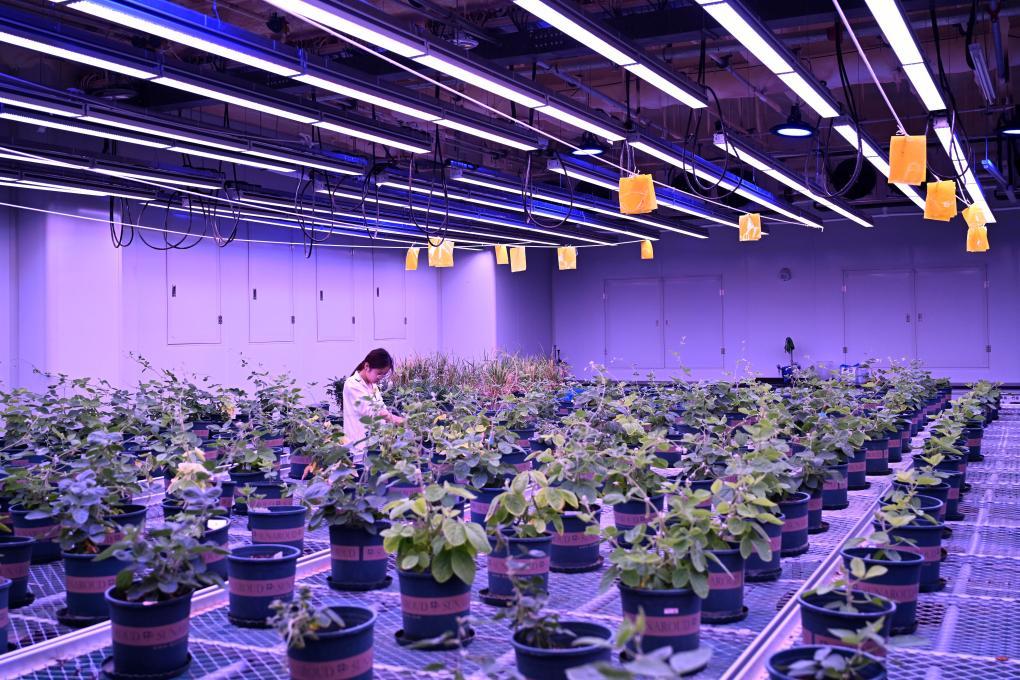 2025年7月6日,研究人員在位于安徽宿州的黃淮海(宿州)種業(yè)科技谷南京農(nóng)業(yè)大學(xué)大豆生物育種中心人工氣候室查看大豆長(zhǎng)勢(shì)。新華社記者 黃博涵 攝
