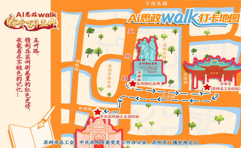 ?線下“行走的課堂”:全國唯一的五卅路成了“天然課堂”,串聯起五卅路紀念碑、萬壽宮(蘇州總工會舊址)、中共蘇州獨立支部等紅色地標,設計出“思政WALK地圖”。職工每到一處,可聆聽學者講解、觀看勞模情景演繹,并通過掃碼闖關答題,深度融入歷史情境。