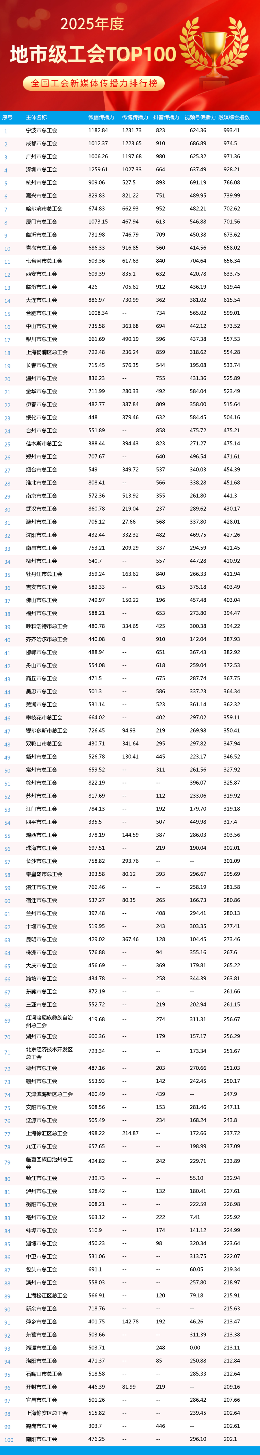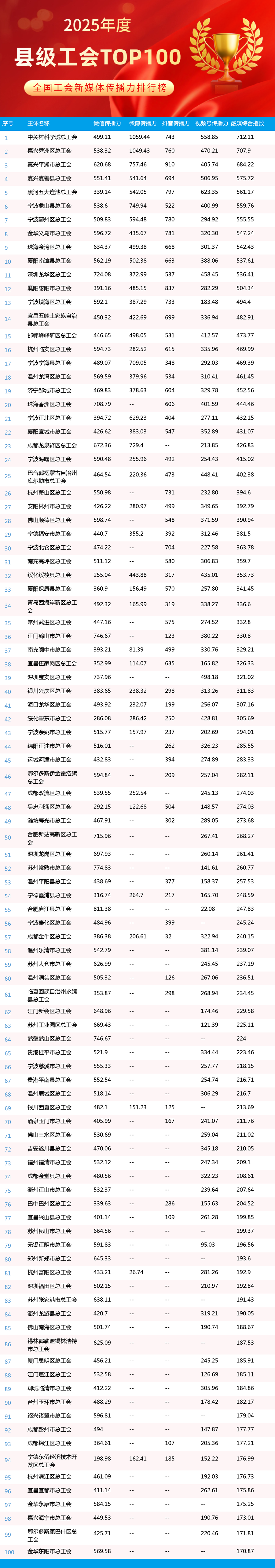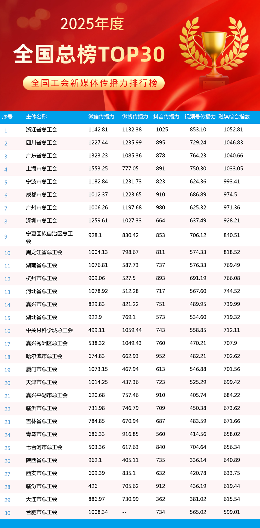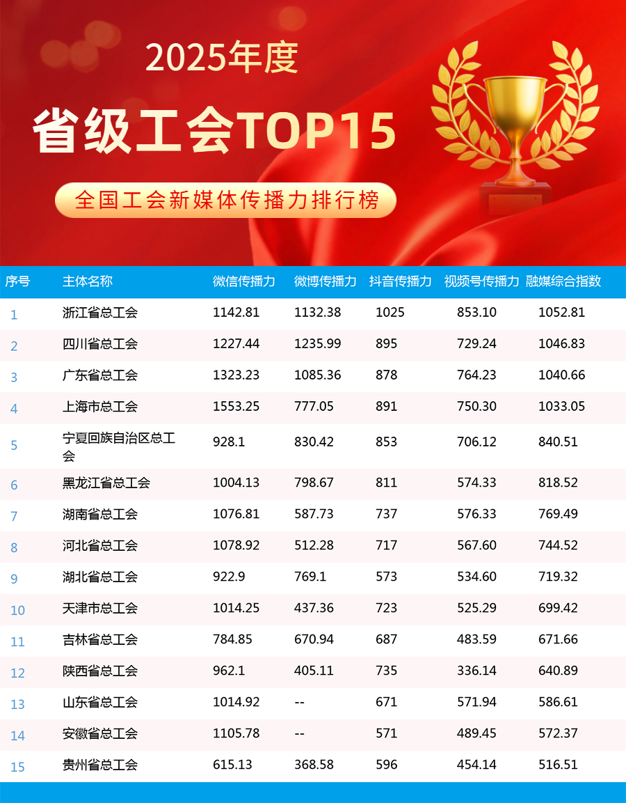 2025年,全國工會新媒體傳播力排行榜持續(xù)發(fā)揮示范引領(lǐng)作用,全年發(fā)布年榜1期、月榜12期,為各級工會新媒體提供了重要展示窗口和交流平臺。