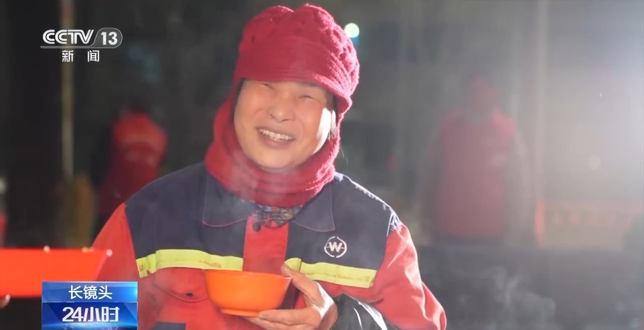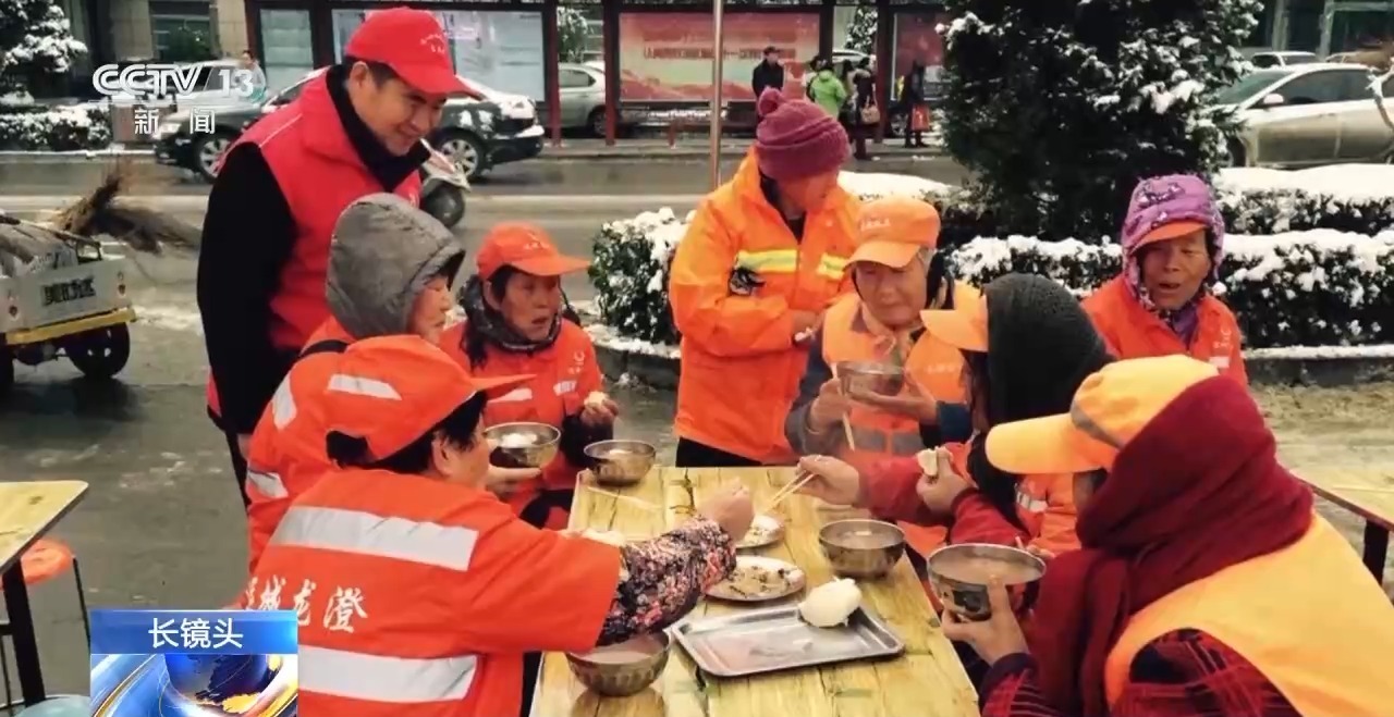 十幾張餐桌圍坐了120多名環(huán)衛(wèi)工人,嚴(yán)寒與疲憊在這一刻蕩然無存,又是一個(gè)溫暖的清晨。