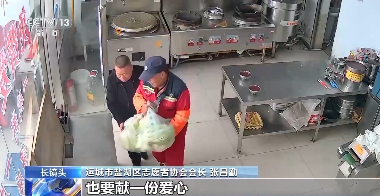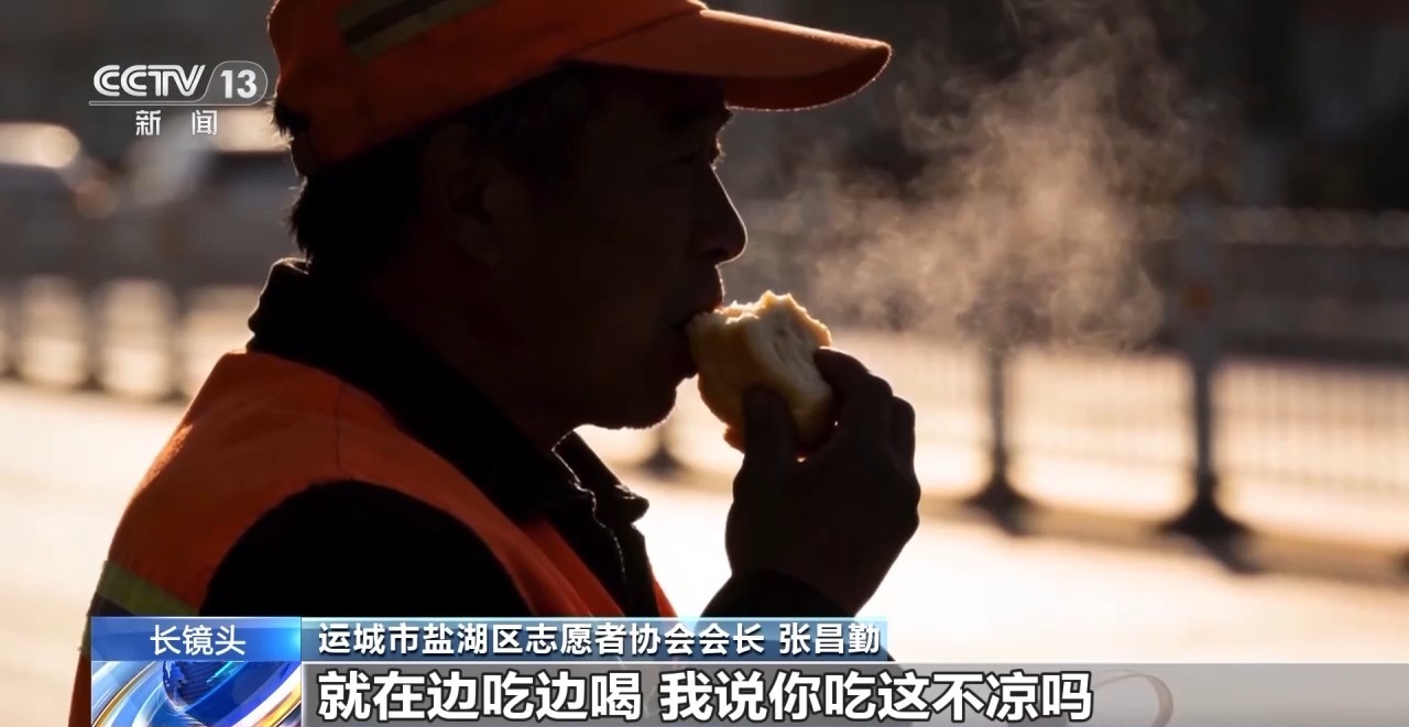 運(yùn)城市鹽湖區(qū)志愿者協(xié)會會長 張昌勤:那天也是早上刮著西北風(fēng),特別冷,那個(gè)大叔就是一個(gè)手拿著涼饅頭,一個(gè)手拿著一瓶涼水,就在邊吃邊喝。我說你吃這不涼嗎?他說涼啥涼,全當(dāng)吃冰棍。