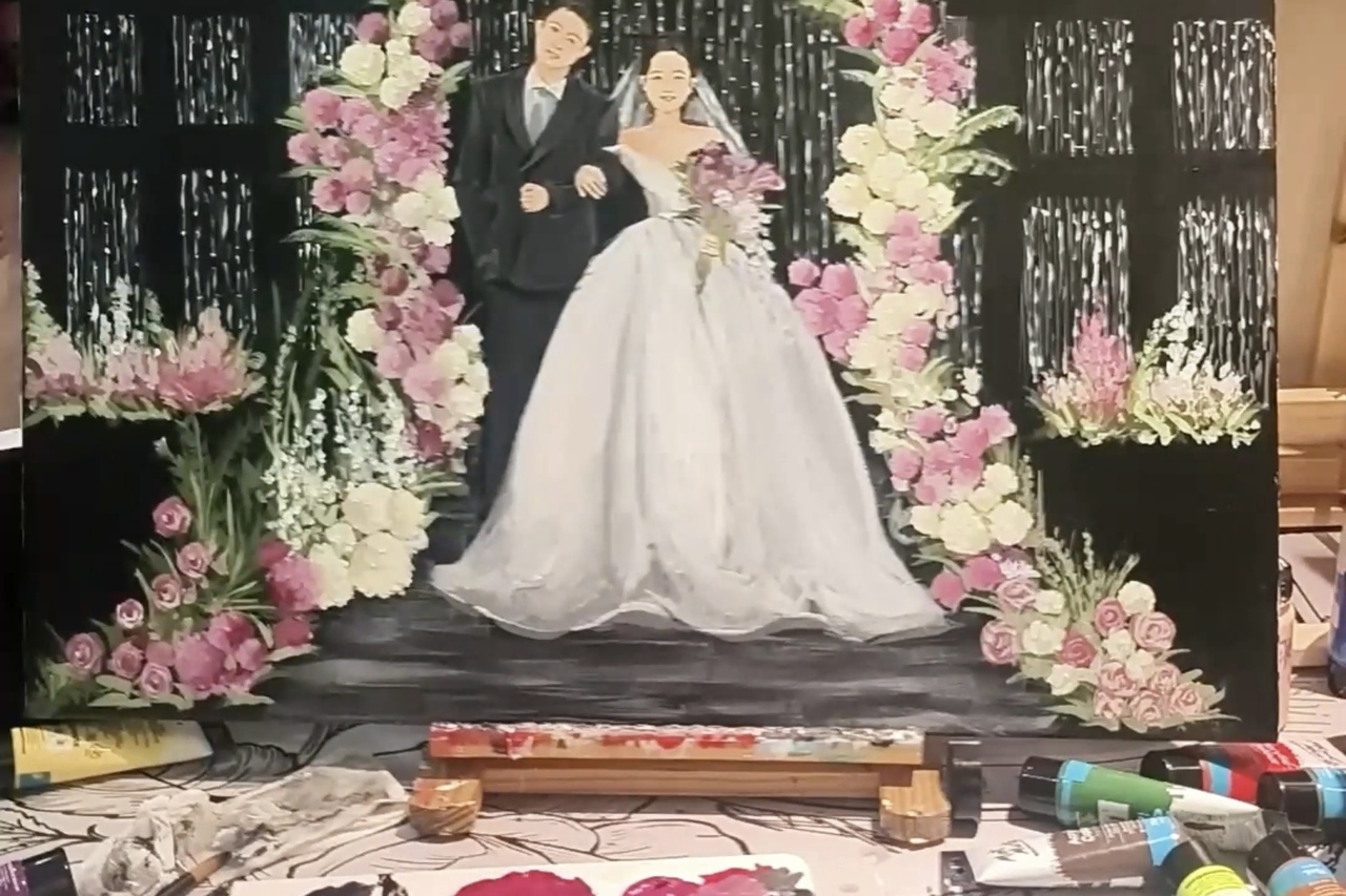 在內蒙古鄂爾多斯的多場婚禮現場,總有一個沉靜的身影引人注目:她支起畫架、手持畫筆,在喜慶喧鬧的氛圍中,以細膩筆觸勾勒新人的笑顏、賓客的祝福,以及現場的精致布景。這位創作者便是徐芙蓉,一名從業僅一年有余的婚禮畫師。入行至今,她已用畫筆見證了30場婚禮的浪漫溫情,卻未曾品嘗過一粒象征喜悅的喜糖。