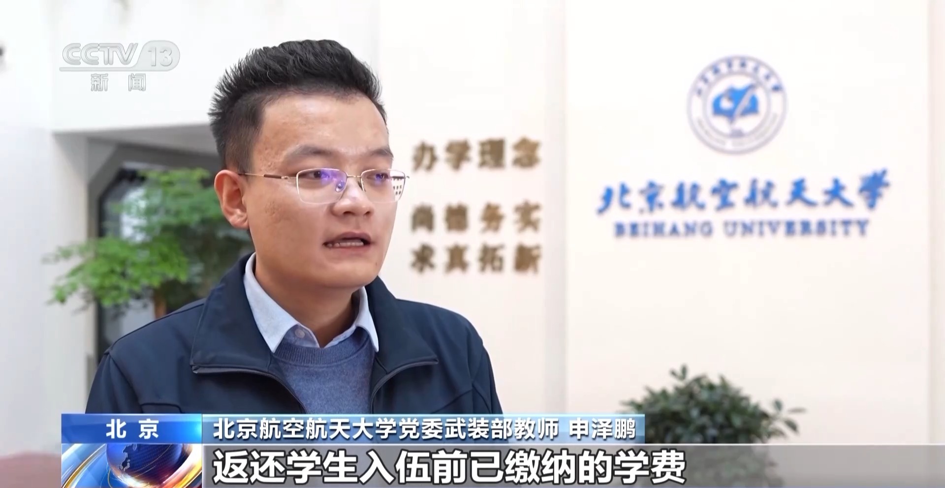 北京航空航天大學黨委武裝部教師 申澤鵬:學費補償是指返還學生入伍前已繳納的學費,未繳納的就直接免除,已繳納的就全額退還。代償指的是學生應征入伍前,如果已申請國家助學貸款,國家也會幫著學生去代償,完成這部分貸款的還清。