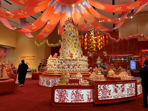 那是陜西省澄城縣紅云花饃農民專業合作社帶來的作品《大鼓棗山》。它高4.5米,直徑3.6米,以鼓為基,以棗山為魂,龍鳳盤踞頂端,百花簇擁周身。合作社社長、澄城面花縣級代表性傳承人惠相樓望著作品說:“棗山上的五谷豐登、連年有余、花鳥生肖,每個實物都有講究,這就是非遺所凝結的中國人的美好情感。”