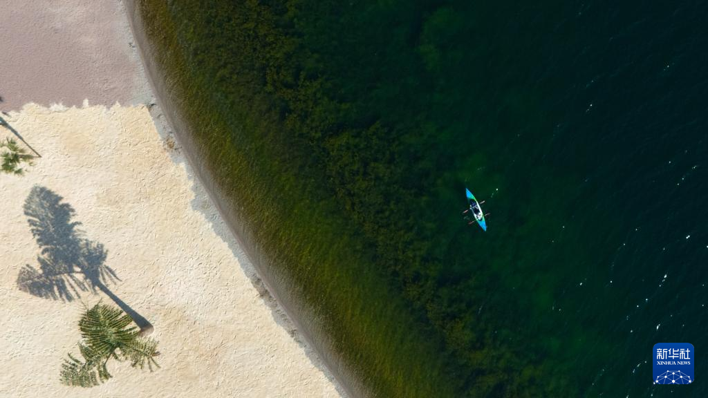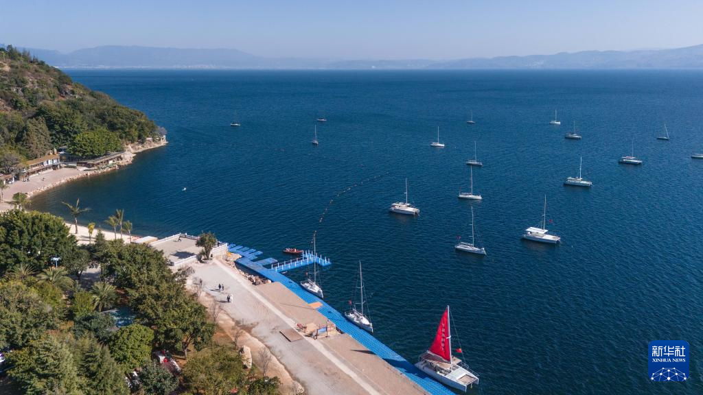 1月27日,游客在云南省玉溪市撫仙湖劃船游玩(無人機照片)。新華社記者 高詠薇 攝