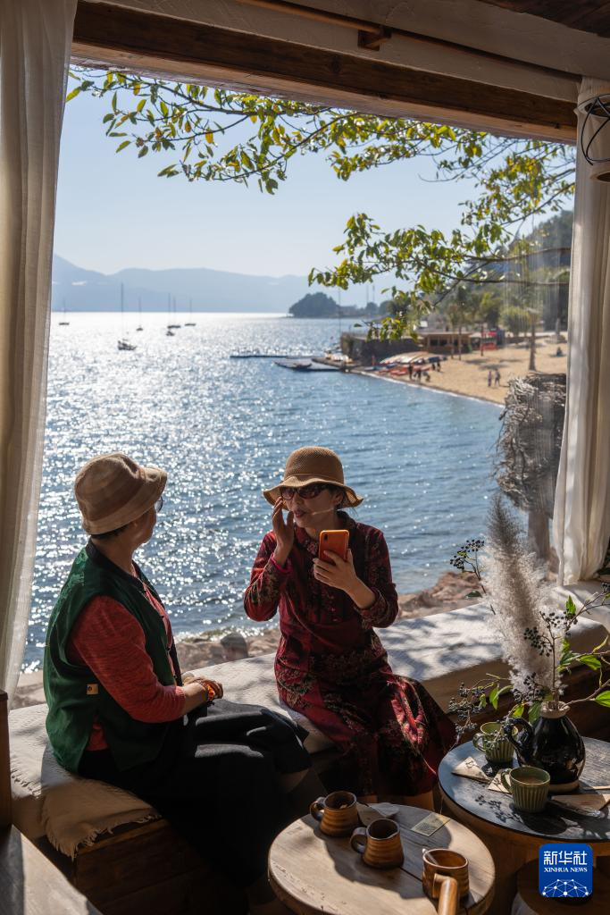 1月27日,游客在云南省玉溪市撫仙湖畔一家咖啡廳休閑。新華社記者 高詠薇 攝