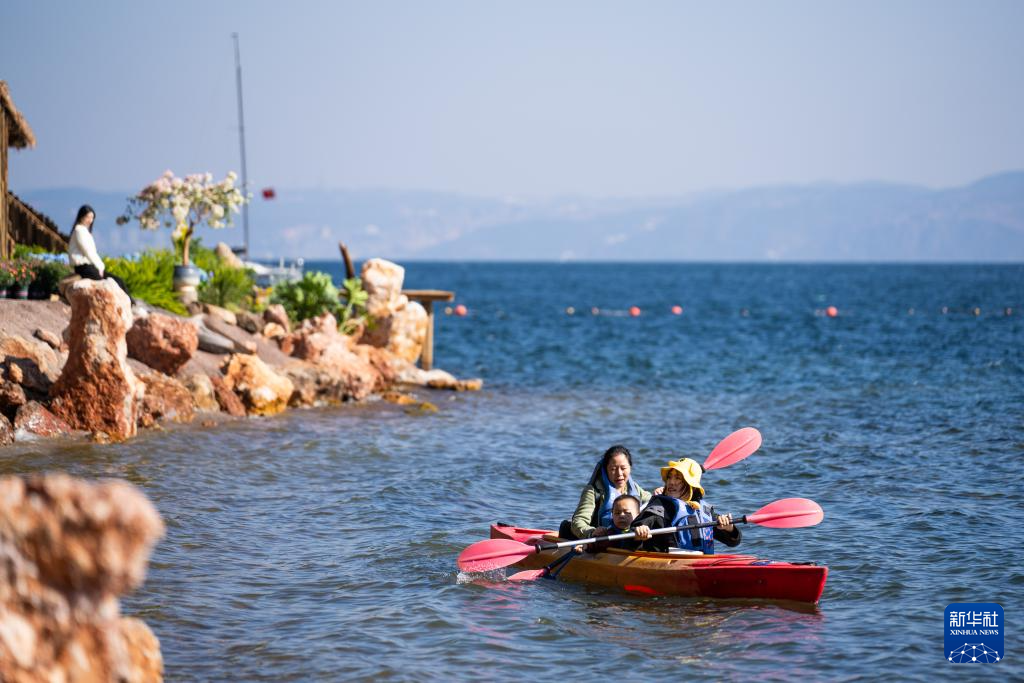 1月27日,游客在云南省玉溪市撫仙湖劃船游玩。新華社記者 高詠薇 攝