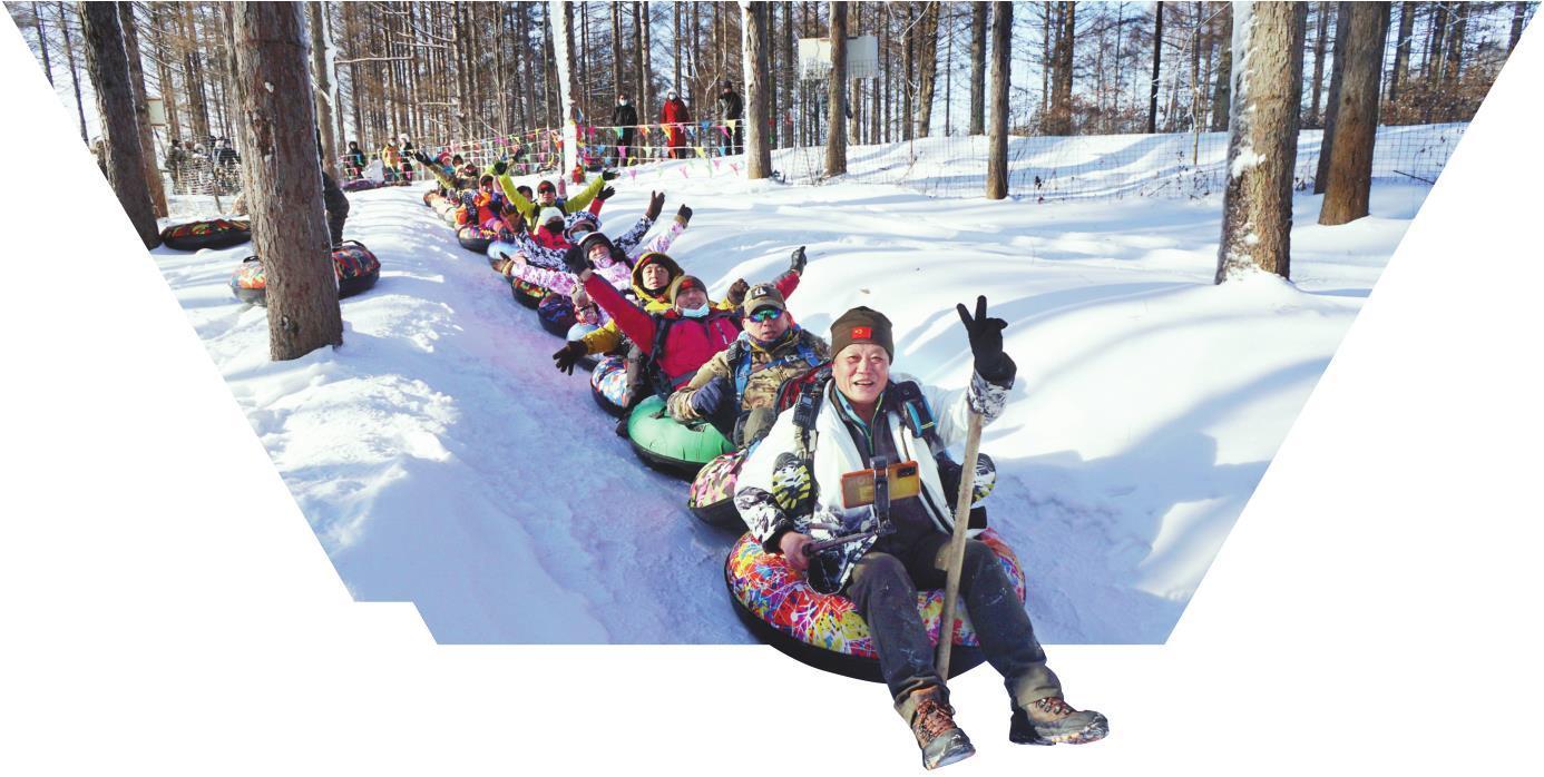 玉龍溪景區內,游客乘雪圈穿梭在林間雪道,解鎖冰雪新體驗。遼寧日報特約記者 門瑩 攝