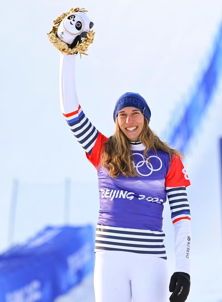 2022年2月9日,獲得亞軍的法國選手克洛艾·特雷斯珀什在頒發紀念品儀式上。當日,北京2022年冬奧會單板滑雪女子障礙追逐決賽在張家口云頂滑雪公園舉行。新華社記者 胡虎虎 攝
