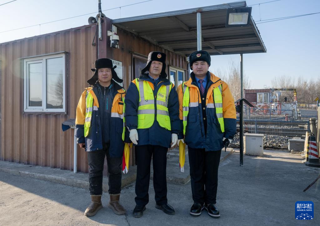2月1日,通讓線27公里道口工長徐中成(左二)與工人彭博(左一)、張浩在道口值班室前合影。新華社記者 連振 攝
