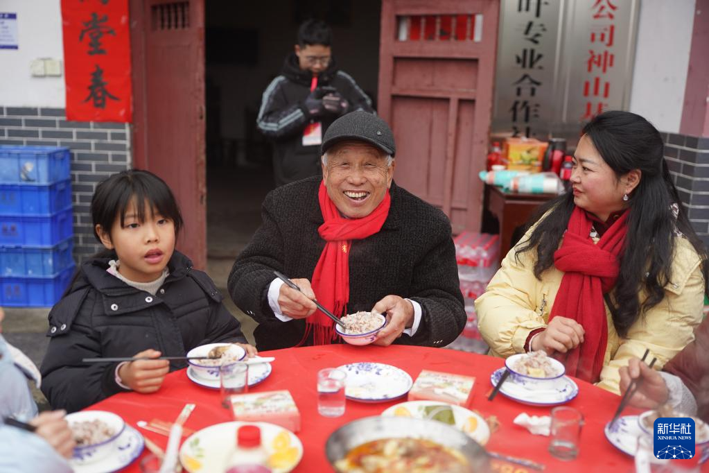 村民們參加神山村舉辦的“神山宴”活動(2月1日攝)。新華社記者 周密 攝