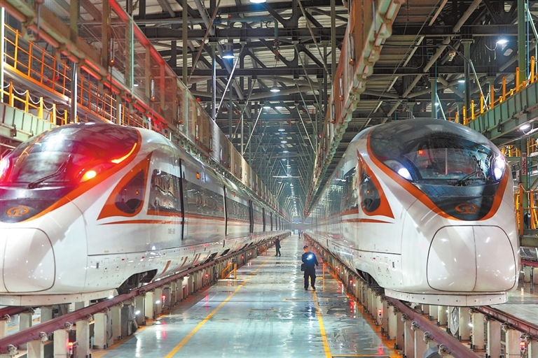 在這里,它們經過全面清洗、細致檢修,隨后整齊停入指定位置,準備投入次日繁忙的春運旅途。