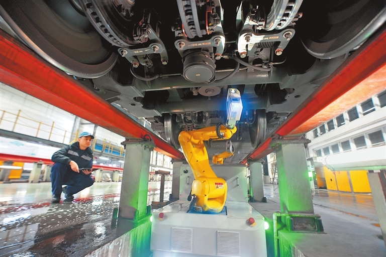 走進動車段檢修庫,只見最新型復興號和以往常見的和諧號等各類動車組正有序接受檢修。一臺智能機器人在車底靈活穿梭,自動檢查底盤關鍵部件;一旁的工作人員通過電腦精準操控機械臂,實現人機協同作業。智能化檢修為高鐵安全運維增添科技保障。