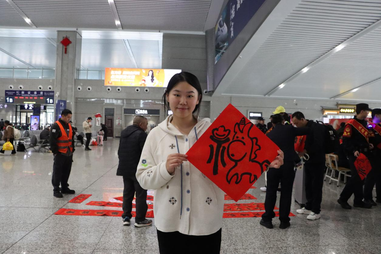 “您好,能幫我寫(xiě)個(gè)有小‘馬’的‘福’字嗎?”“沒(méi)問(wèn)題,很快就能讓你帶‘?!丶摇薄衔?時(shí)許,候車廳的“春運(yùn)揮毫·春聯(lián)送吉”服務(wù)區(qū)擠滿了候車旅客,一位拖著行李的年輕姑娘指著手機(jī)中的圖片與義務(wù)寫(xiě)春聯(lián)的書(shū)法愛(ài)好者輕聲交流,不時(shí)看看時(shí)刻表,眼神里充滿歸鄉(xiāng)的期盼。