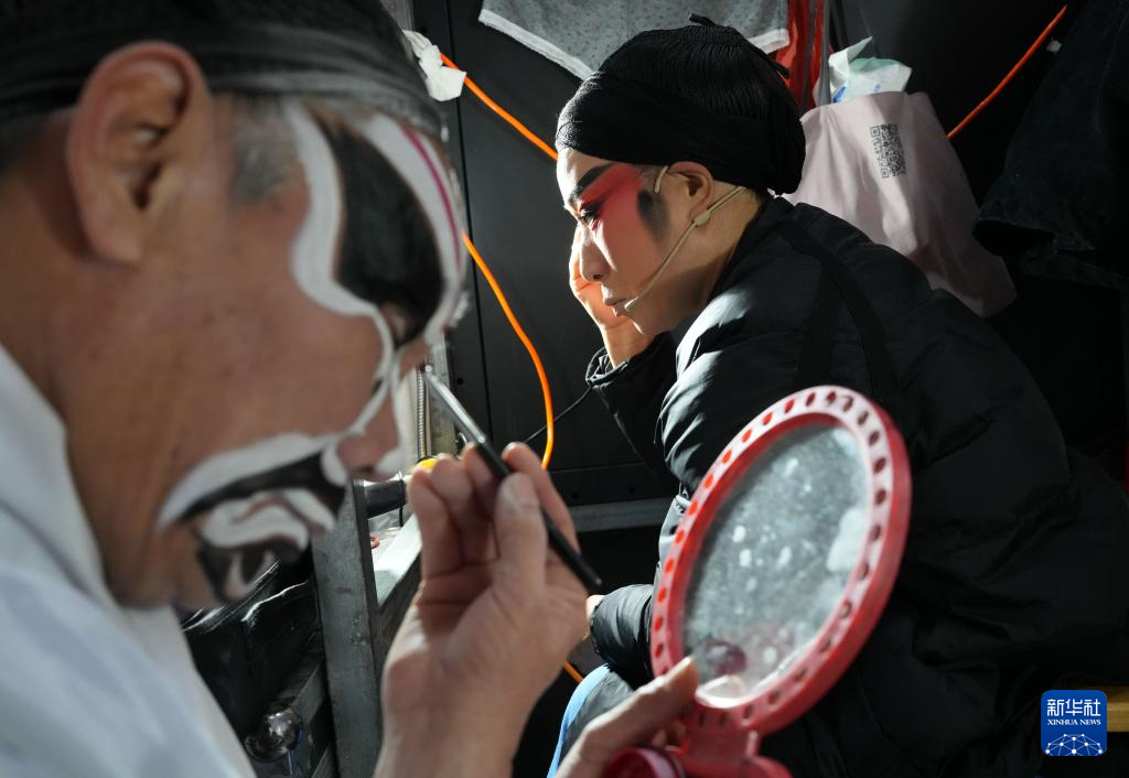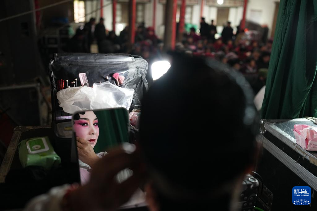 1月27日,在金華市婺城區莘畈鄉吳村,九州婺劇團的演員在演出前化妝。新華社記者 翁忻旸 攝