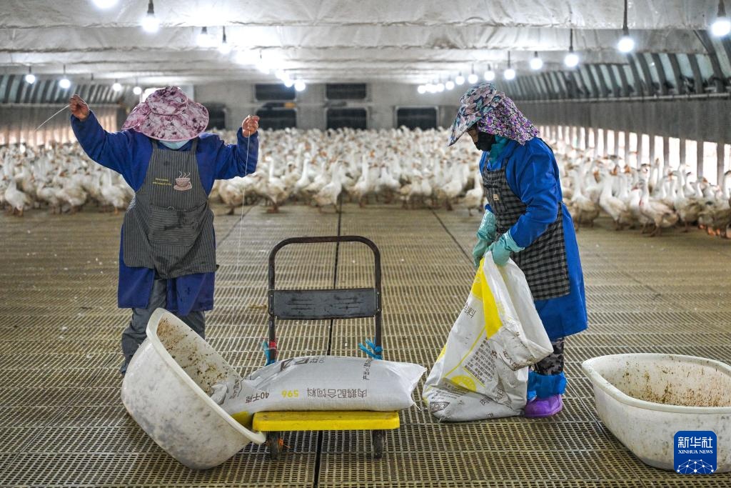 工人在貴州省錦屏縣新化鄉歐陽村的生態鵝育雛基地給種鵝投食(2026年1月21日攝)。新華社記者 楊文斌 攝
