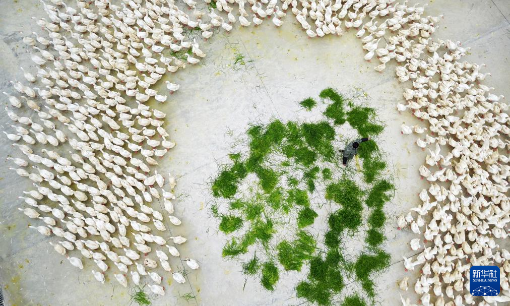 工人在貴州省錦屏縣銅鼓鎮馬臺生態種鵝養殖基地投放草料(2020年3月11日攝,無人機照片)。新華社記者 楊文斌 攝