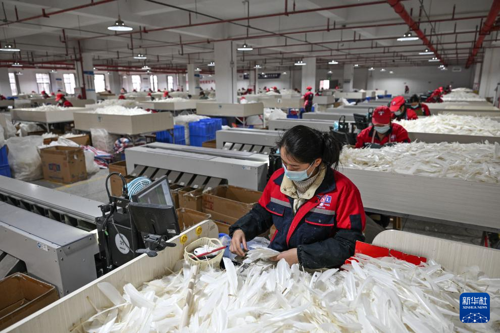 工人在貴州錦屏經濟開發區羽毛球生產基地分級生產羽毛球所需的鵝毛(2026年1月22日攝)。新華社記者 楊文斌 攝
