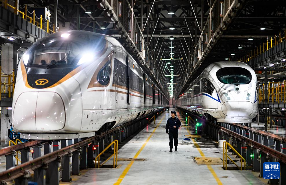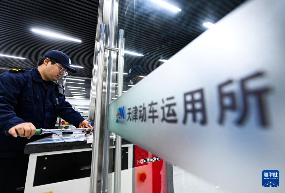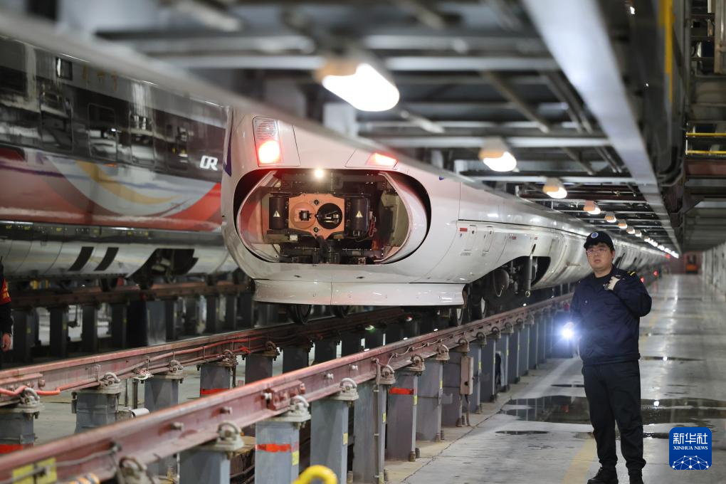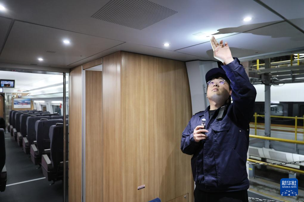 2月2日,在天津動車運用所檢修庫內(nèi),李奇?zhèn)z查正在出庫的一組列車。新華社記者 趙子碩 攝