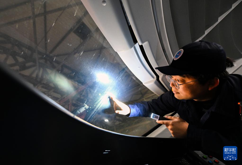 2月2日,在天津動車運用所檢修庫,李奇?zhèn)z查列車駕駛室的雨刮片。新華社記者 趙子碩 攝