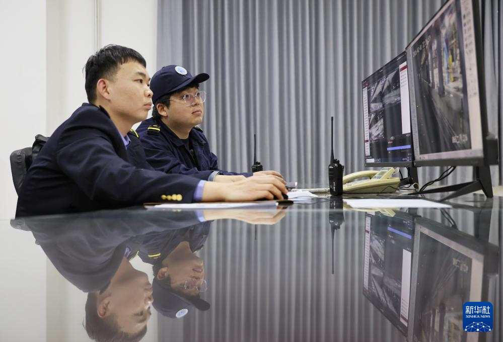 2月1日,在天津動車運用所,李奇?zhèn)ィㄓ遥┖屯乱黄鸩榭幢O(jiān)控屏幕。新華社記者 李然 攝