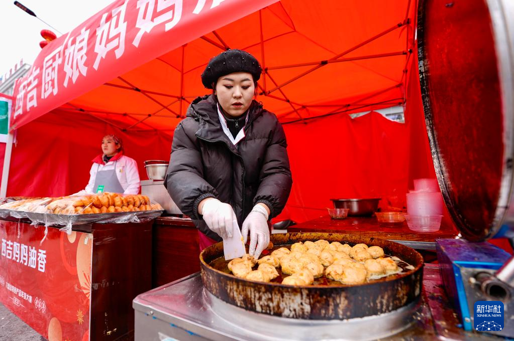 2月3日,商戶在寧夏固原市西吉縣年貨大集上制作小吃。新華社記者 楊植森 攝