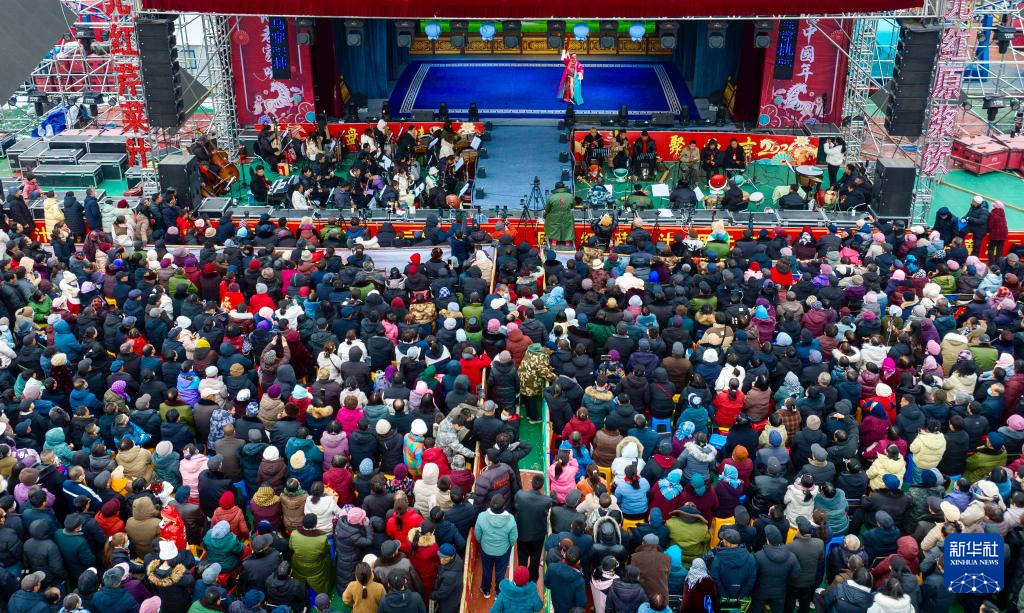 2月3日,人們在寧夏固原市西吉縣年貨大集上觀看秦腔表演(無人機(jī)照片)。新華社記者 楊植森 攝