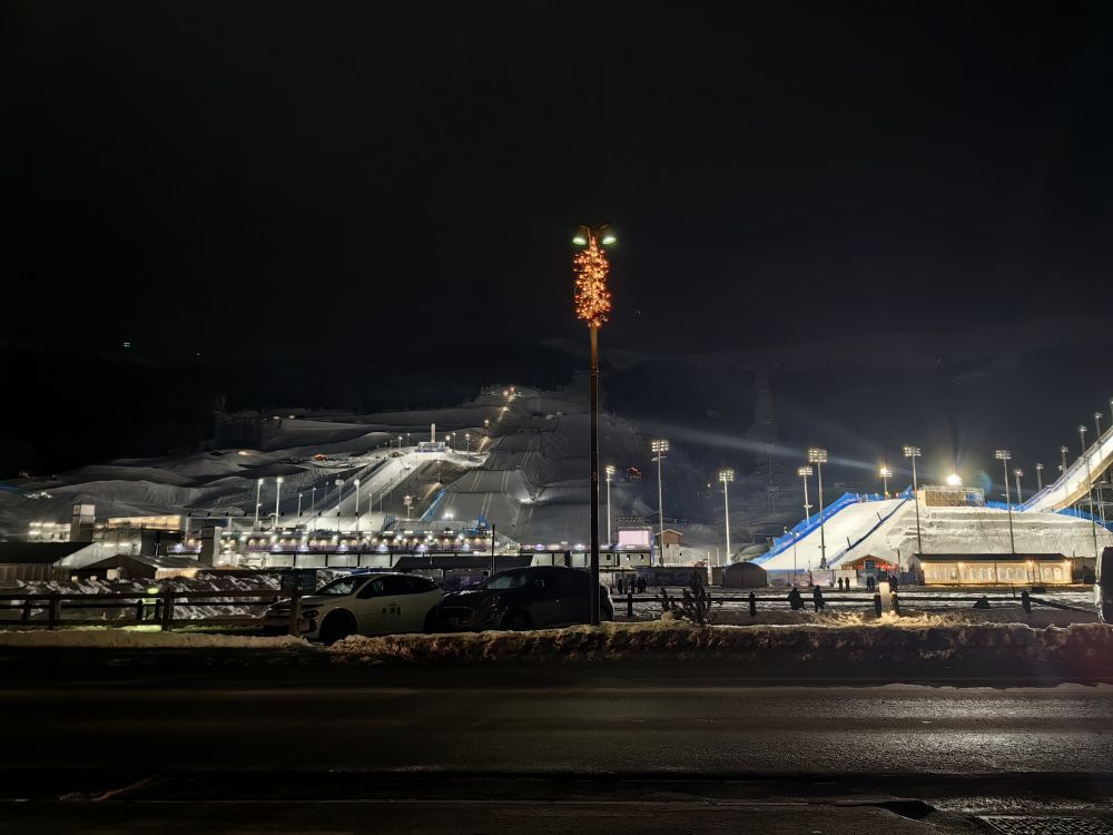 而當夜幕降臨,冬奧會的U型場地和大跳臺被燈光照亮,來自世界各地的運動員與繁星為伴,做著最后的賽前訓練,這里的運動激情徹底被冬奧點燃。