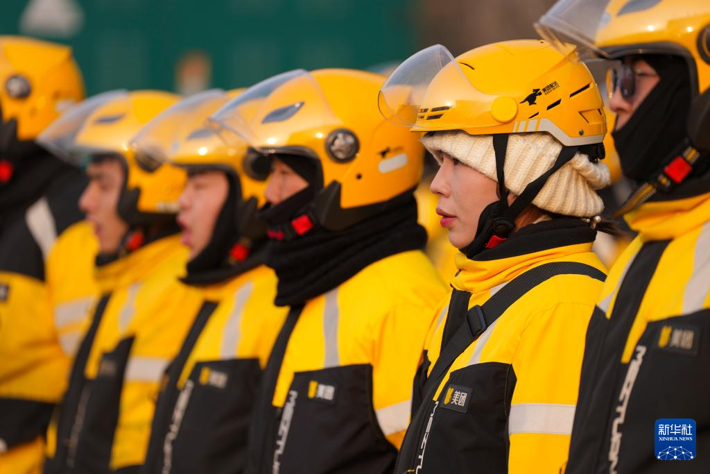 戚德敏(右二)在位于山西省太原市小店區的美團配送合作商服務中心參加早會(1月29日攝)。新華社記者 楊晨光 攝