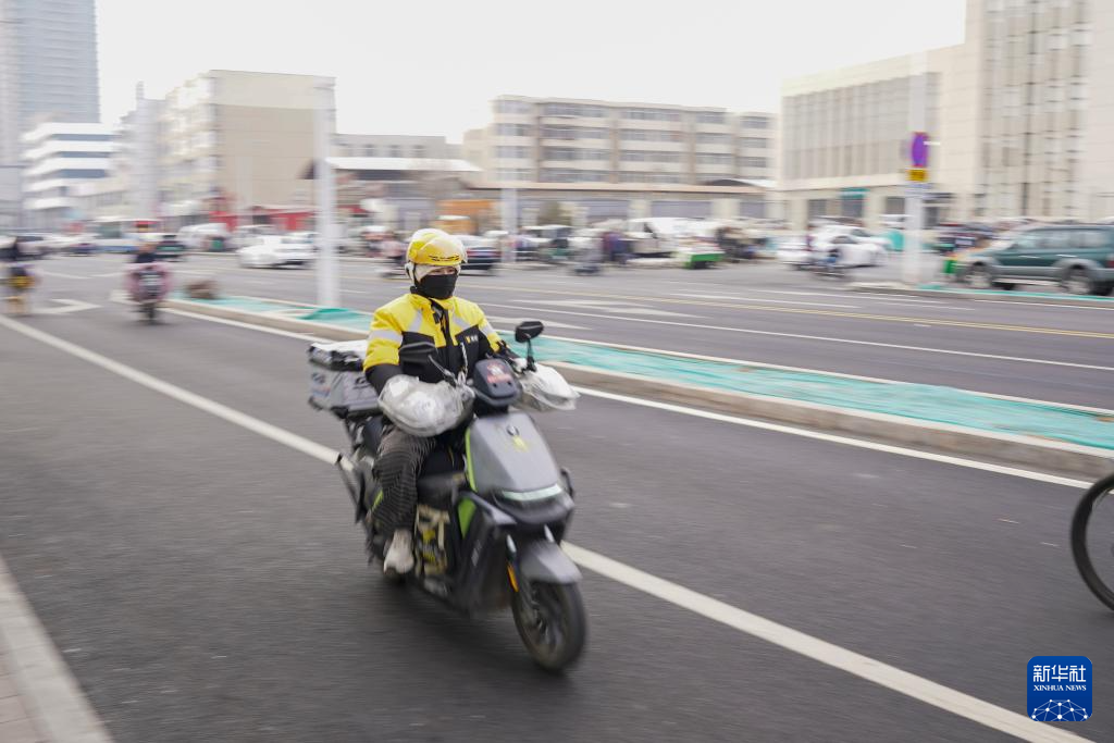 戚德敏騎行在送餐路上(2月4日攝)。新華社記者 楊晨光 攝