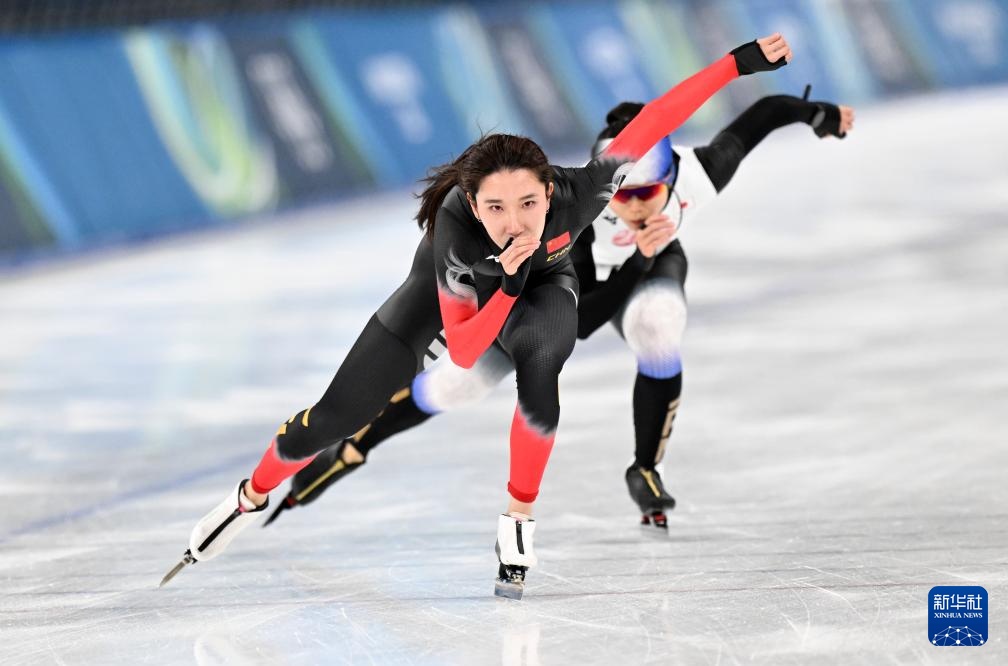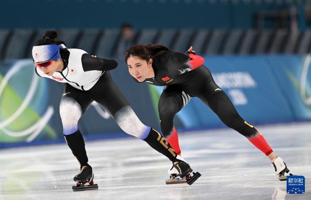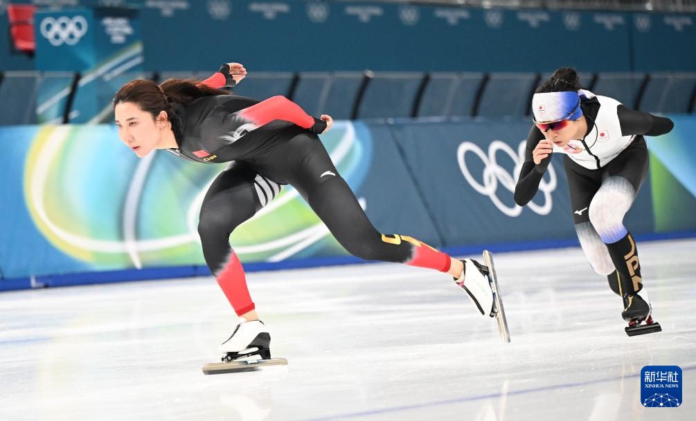 2月5日,中國速度滑冰運動員韓梅(左)和日本速度滑冰運動員高木美帆在訓練中。新華社記者 武巍 攝