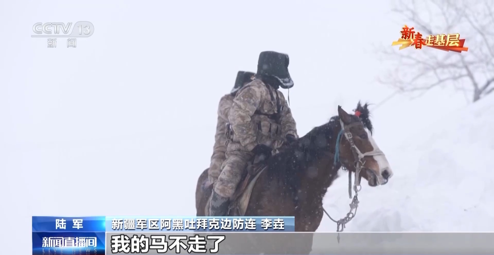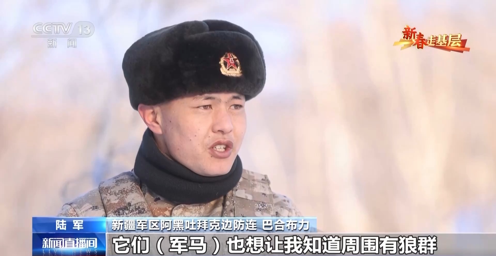 新疆軍區(qū)阿黑吐拜克邊防連 巴合布力:春節(jié)戰(zhàn)備,我和我的馬都不能松懈,軍馬也是全天背著鞍子,隨時待命。在外人眼里,在邊防連就是騎馬、天天趕馬,但是我們自己覺得,我也在時時刻刻準(zhǔn)備為國家犧牲,非常值得。