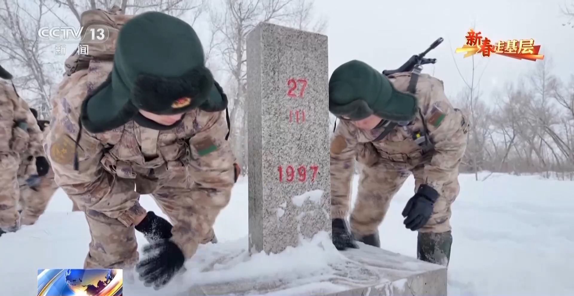 歷經(jīng)八個小時的風(fēng)雪跋涉,穿過沙山、沼澤、白樺林,27號界標(biāo)終于出現(xiàn)在視野中。官兵們下馬,拂去界標(biāo)上的積雪。新兵李垚臉上最初的緊張已褪去,透出戰(zhàn)士的堅毅。