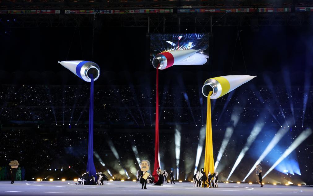 紅、黃、藍三支巨型顏料管出現在開幕式主會場舞臺上空,“顏料”源源不斷地涌出。同時,身著各種色彩、代表意大利不同文化符號的演員在舞臺上盡情舞蹈。這些符號有:古羅馬、文藝復興、美食、時尚、設計、建筑、文學、咖啡、狂歡節……沒錯,這一切都“很意大利”。