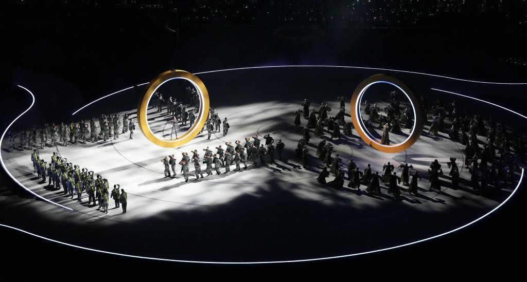 兩名舞者,服飾不同,舞姿各異,分別代表著“城市”與“山脈”。在這場城與山的對話中,兩名舞者各自站在一個圓環中間。圓環緩緩升起,兩人從各自的圓環躍出,象征著走出自己的世界,尋找交匯點,實現人類共通。隨后,更多圓環緩緩上升、彼此交匯,在舞臺上空形成奧運五環標志。