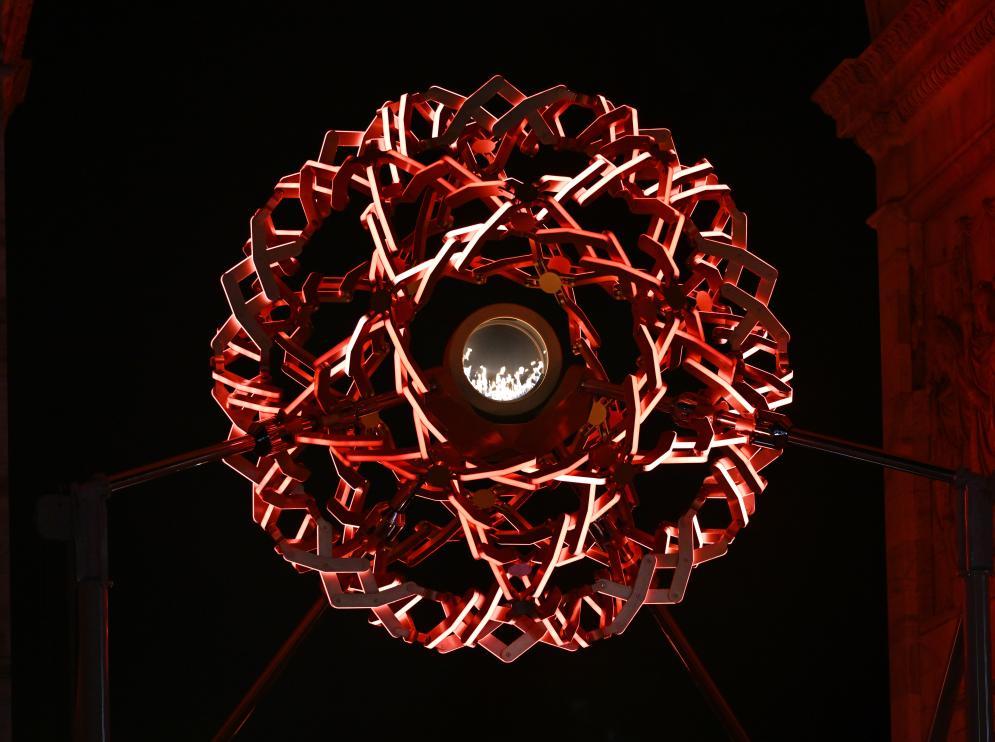 在米蘭的和平拱門,在科爾蒂納的迪博納廣場,兩座同樣的主火炬臺同時被點燃。主火炬臺的外觀靈感來自意大利文藝復興巨匠萊昂納多·達·芬奇繪制的幾何繩結圖案,其結構采用可變幾何設計,可實現動態開合,就像孩子們玩耍的“魔術伸縮球”。當被點燃的剎那,主火炬臺表面呈現出陽光般的金色質感。