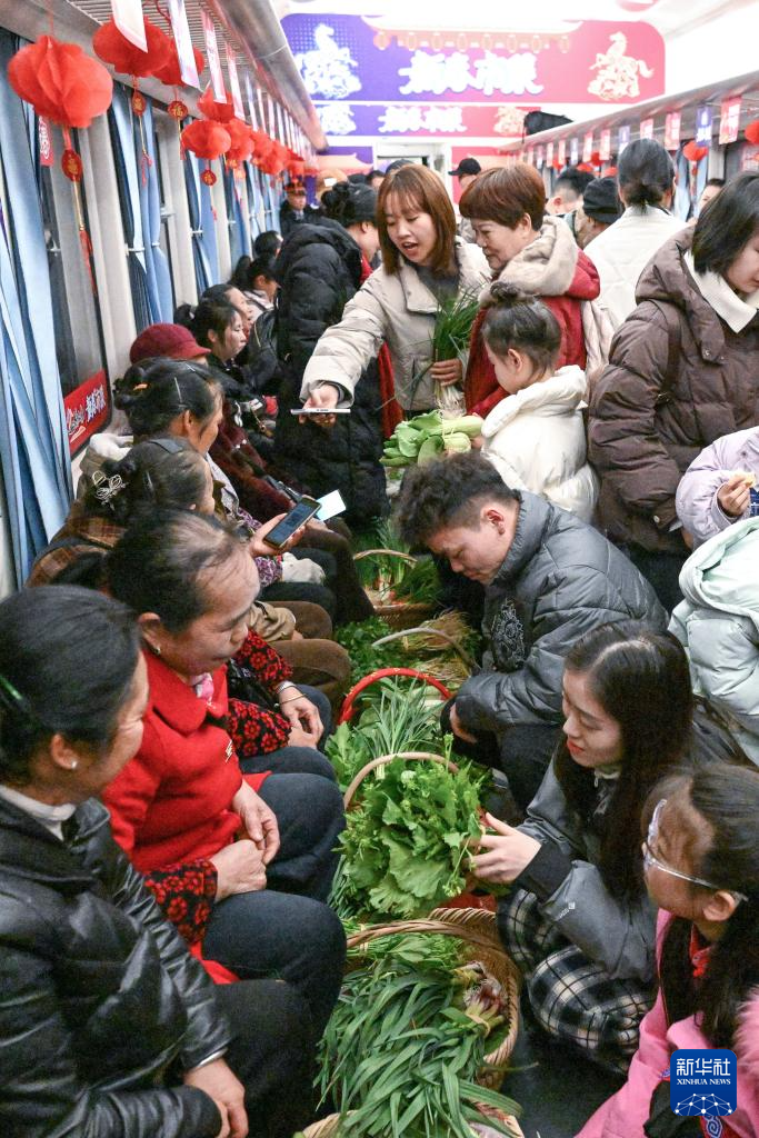 2月8日,村民在5640次“慢火車”上售賣自家種植的蔬菜。新華社記者 楊文斌 攝