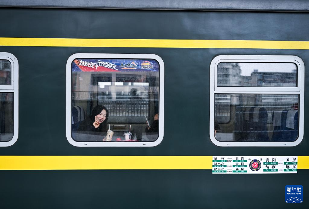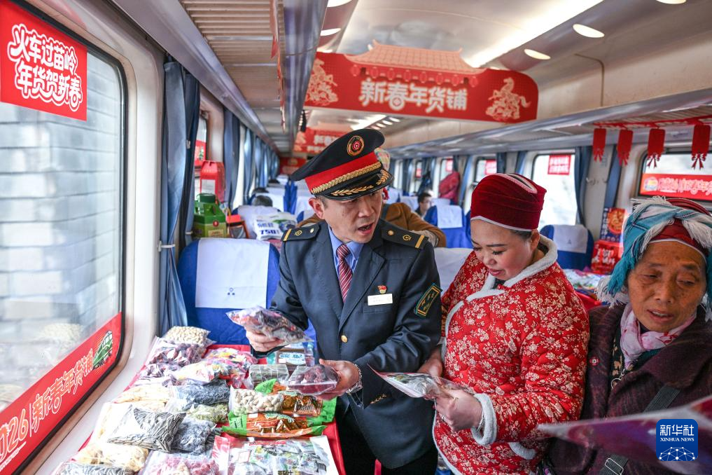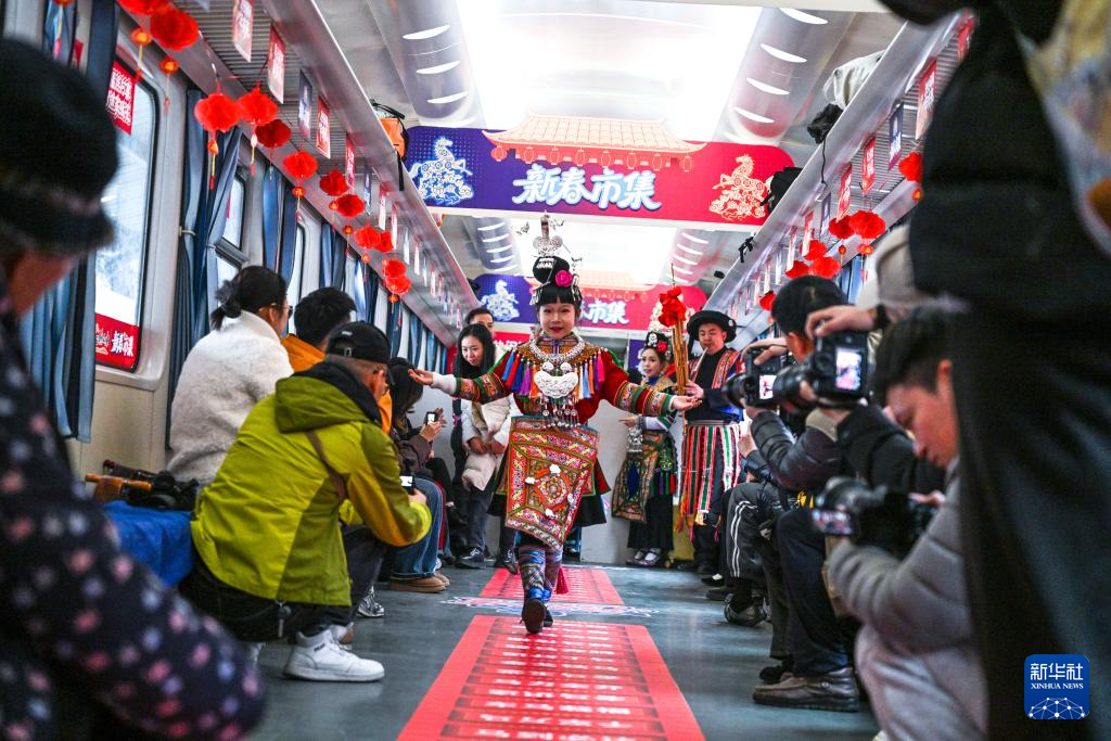 新春將至,貴州貴陽開往玉屏的5640次“慢火車”裝飾一新,喜慶的車廂、新鮮的農產品、特色民族歌舞、精美非遺展示等讓這趟穿行于苗鄉侗寨的山區“慢火車”載滿濃濃的新春年味。