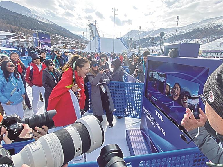 比賽結束后,谷愛凌跑到場邊,第一時間和母親擁抱。隨后,她來到一臺電視機前,與親友團通過視頻相見,分享喜悅。