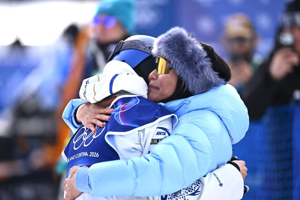 2月9日,谷愛凌(左)在完成第一跳后和媽媽擁抱。新華社記者 張宏祥 攝