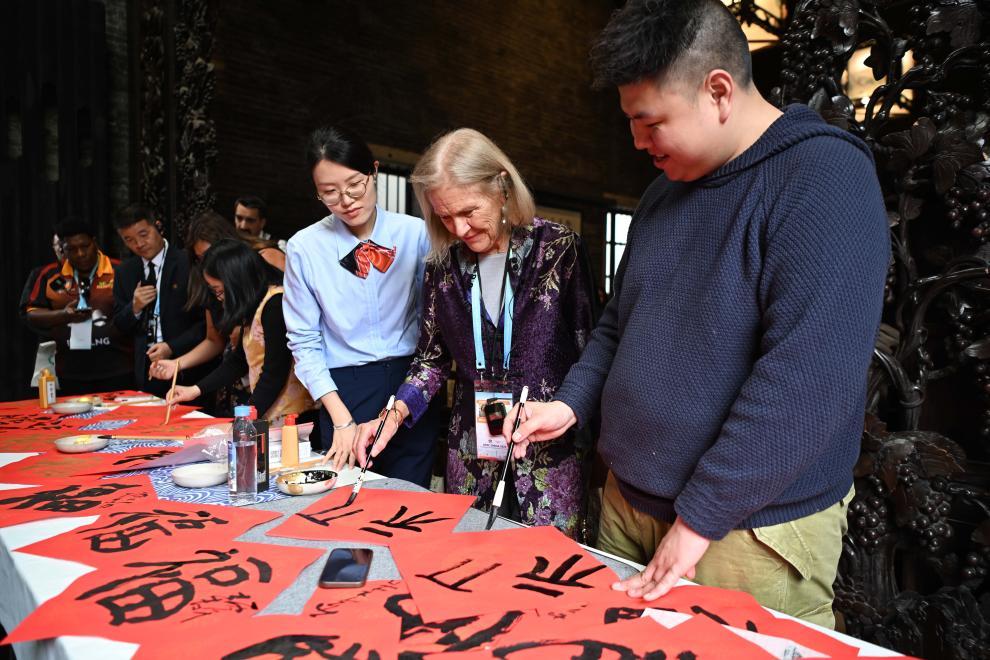 2月6日,亞太經濟合作組織(APEC)2026年第一次高官會及相關會議的部分與會代表在廣州陳家祠體驗中國書法。 新華社記者 鄧華 攝