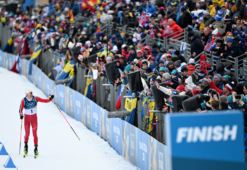 2月10日,挪威選手克萊博(左)在沖過終點(diǎn)后與觀眾互動。新華社記者 賀燦鈴 攝