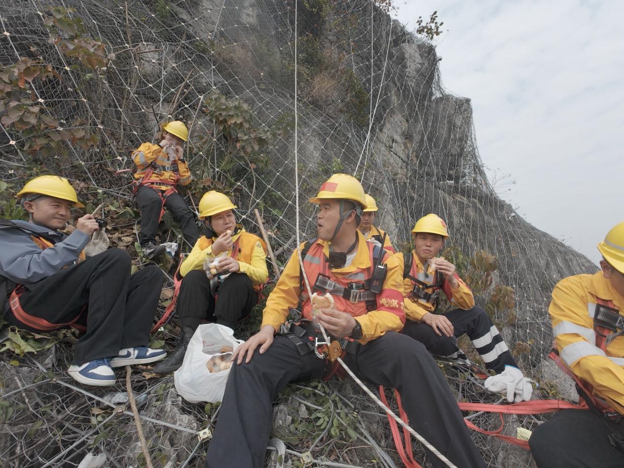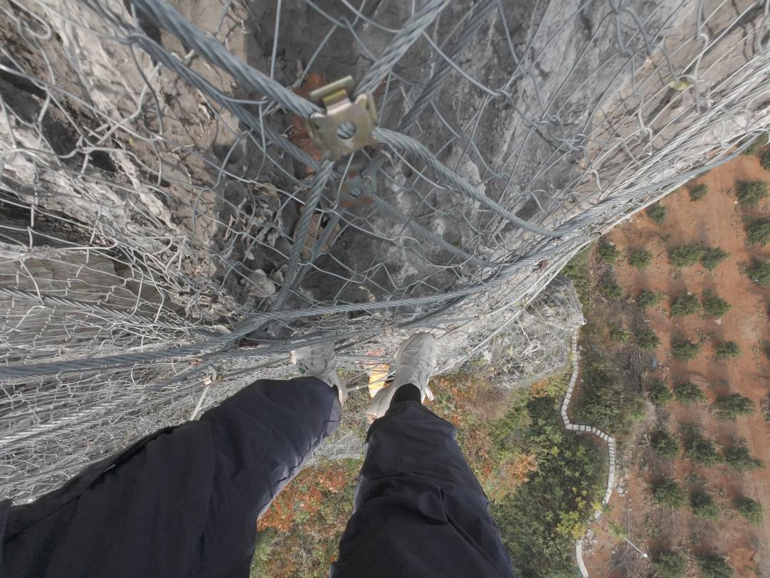 在抵達目標位置前,隊員們還需要攀爬一段近乎90度的崖壁。大家腳下踩著只能容下五分之一個腳掌的防護網,手也必須緊緊抓住防護網,一刻不容放松。