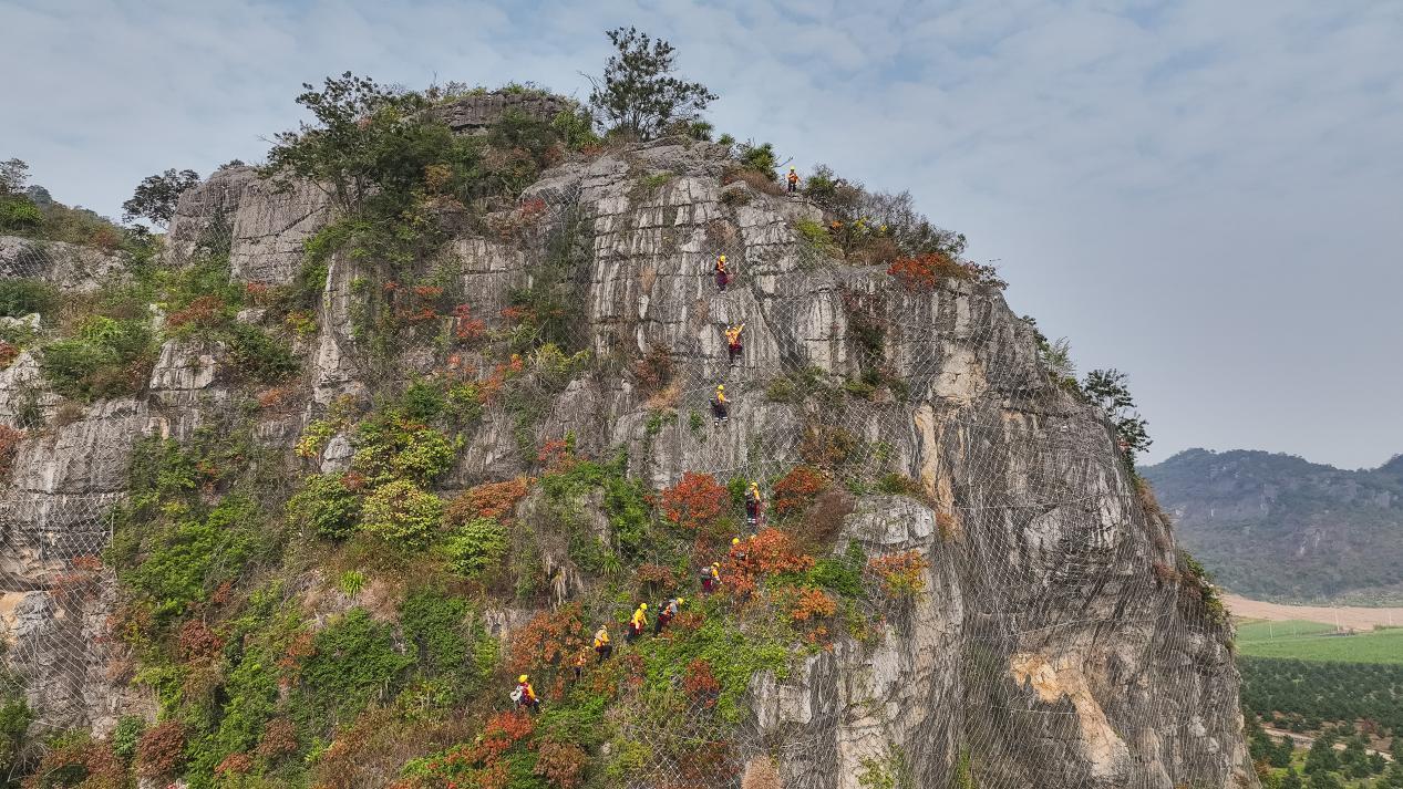 一個半小時后,“爬山虎”突擊隊抵達崇左市的一個作業區,四周全是陡峭的石山。隊員們從車上卸下裝備,開始穿戴安全繩和安全帽。“主要任務是檢查既有的主動網、被動網是否有松動、脫落、銹蝕,或者有包裹不到位的危石”,楊發登和隊員們要嚴格按照要求在天窗期內,也就是沒有火車通過的時候作業,施工時間有限。