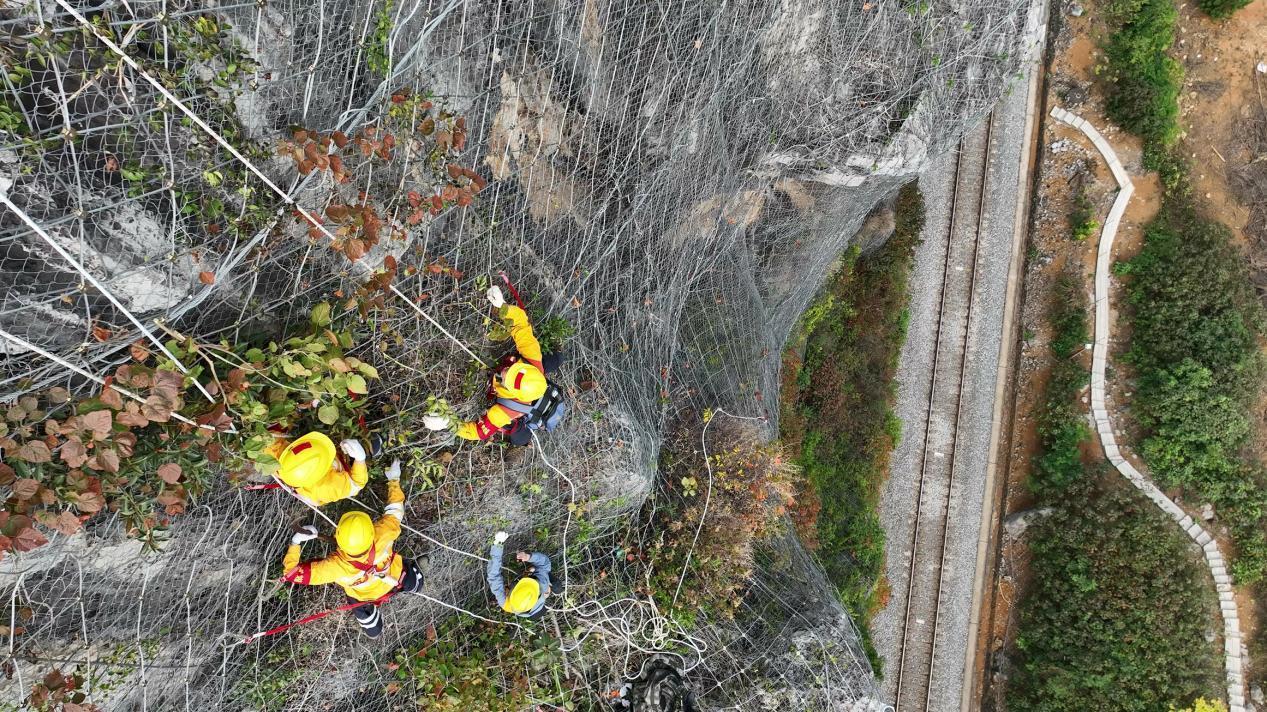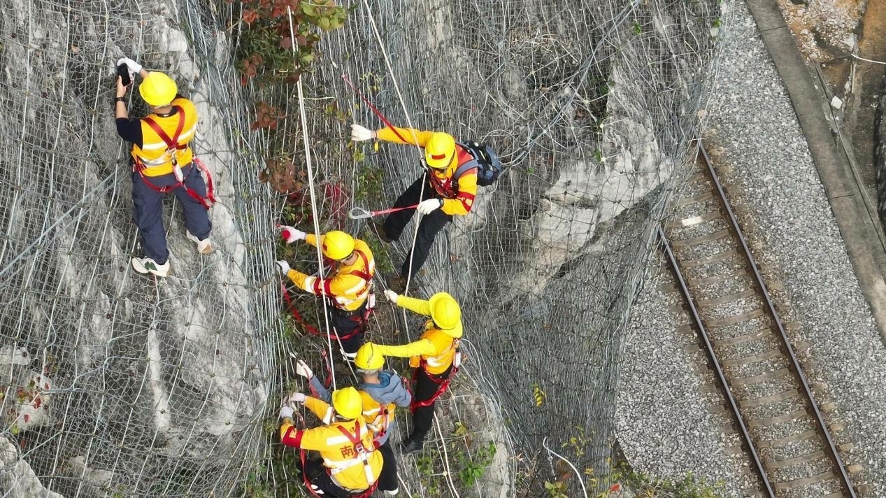 楊發登所在的南寧工務段“爬山虎”突擊隊,負責勘察鐵路沿線137處危巖落石風險點的巖石狀態,測量、拍攝、記錄、處理可能影響到鐵路安全的危石。