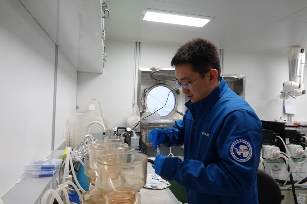 2026年2月,“雪龍”號大洋隊隊員邢磊在舯甲板生物實驗室進行海水過濾操作。新華社記者 顧天成 攝
