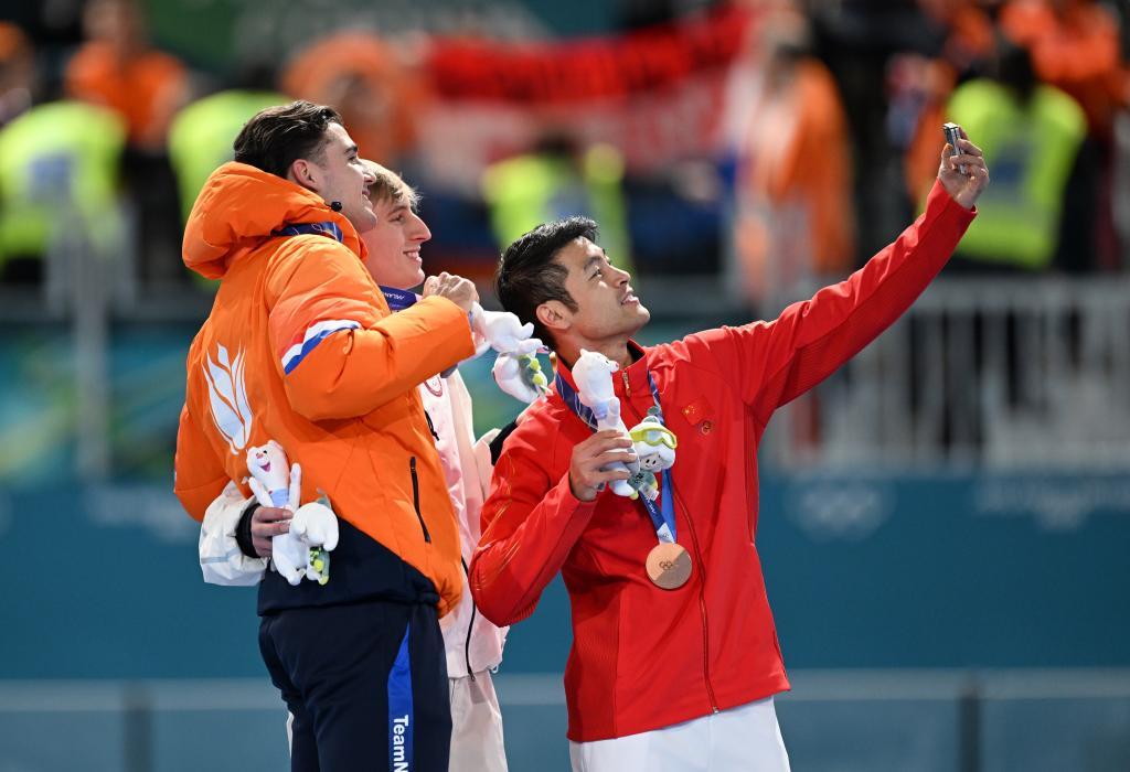 2月11日,冠軍美國選手斯托爾茲(中)、亞軍荷蘭選手德布(左)和季軍中國選手寧忠巖在頒獎儀式上自拍。新華社記者 武巍 攝