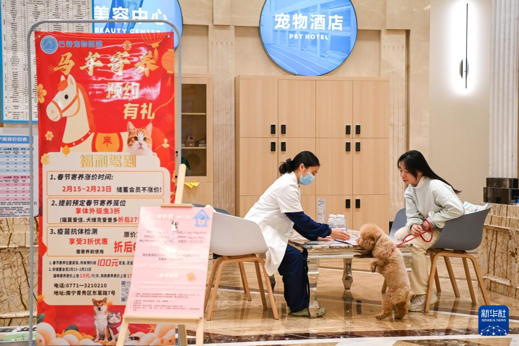 2月1日,在廣西南寧一家提供寵物寄養業務的寵物醫院,工作人員(左)在介紹寄養服務的內容。新華社記者 曹祎銘 攝