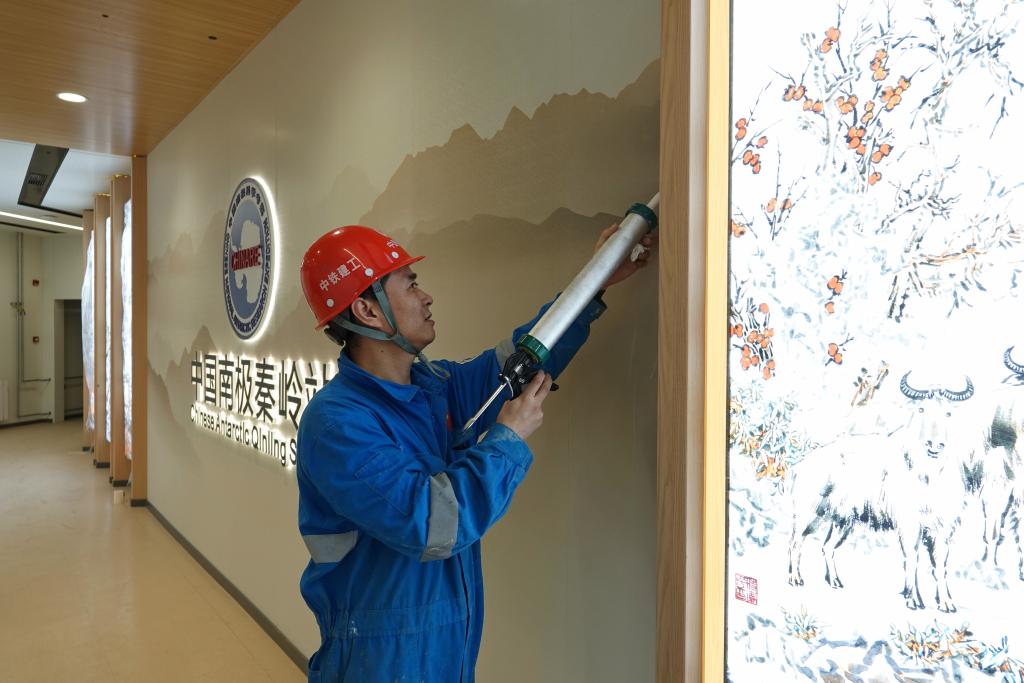 中鐵建工集團(tuán)南極秦嶺站項目裝飾負(fù)責(zé)人馬斌正進(jìn)行裝飾收尾工作。新華社顧天成 攝
